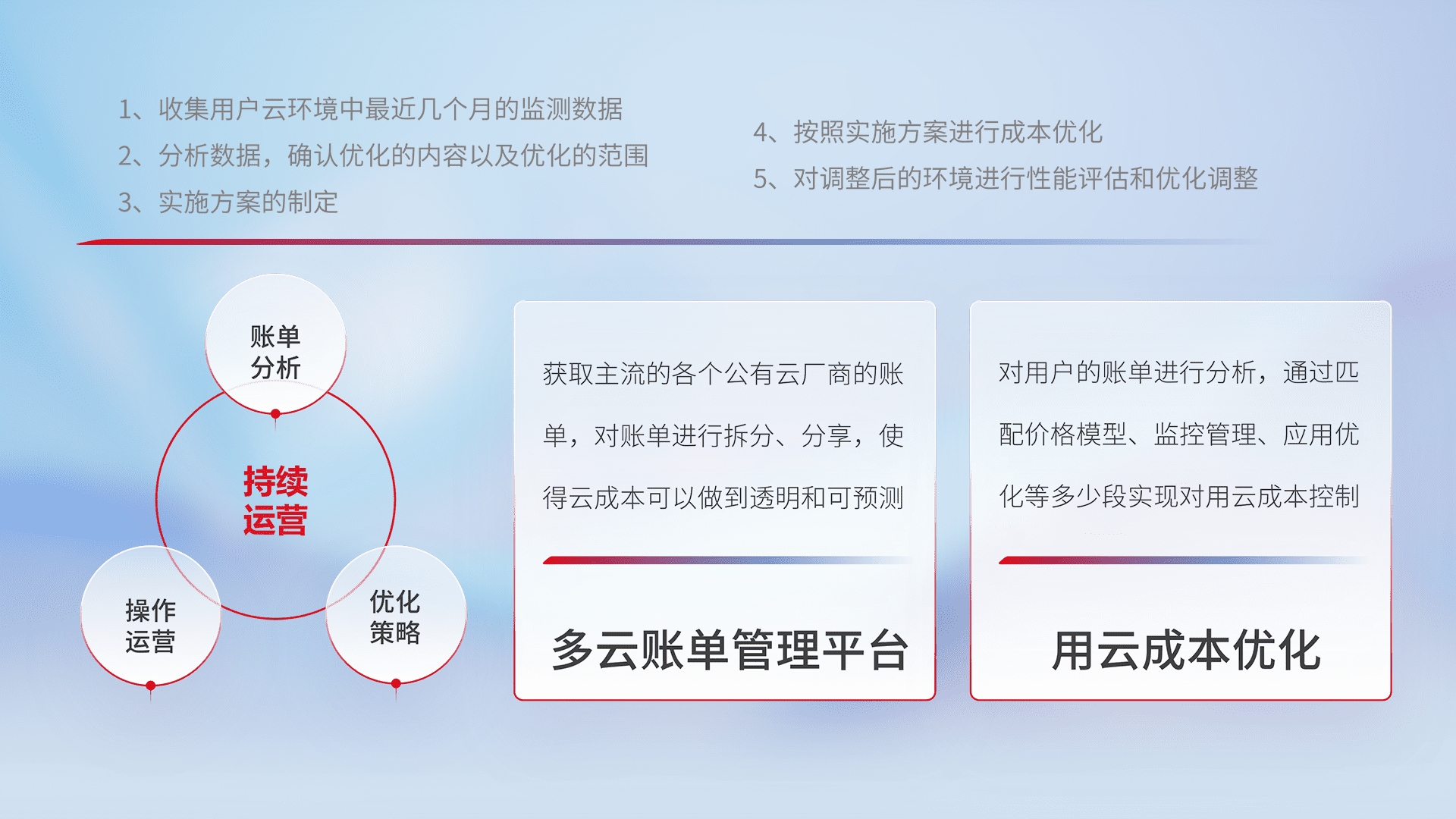 通过多云纳管,,以统一的资源数据模型把客户的云资源进行抽象和封装,,,进而实现对多云资源的统一操作,,保障云资源管理的可靠性、、、稳定性与可用性。。。量身定制化运维内容,,,配置、、开发运维、、、补丁管理、、备份、、、、监控、、认证和访问管理、、、、审计和日常巡检等,,保障在用云过程中的可靠度,,,,稳定度以及高可用率。。